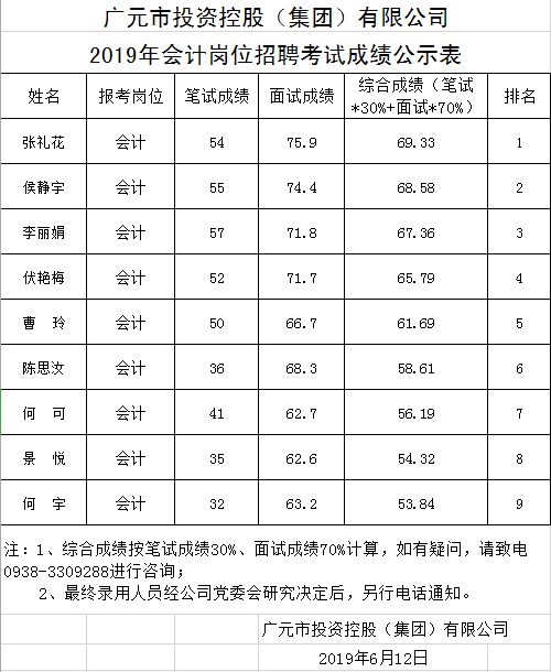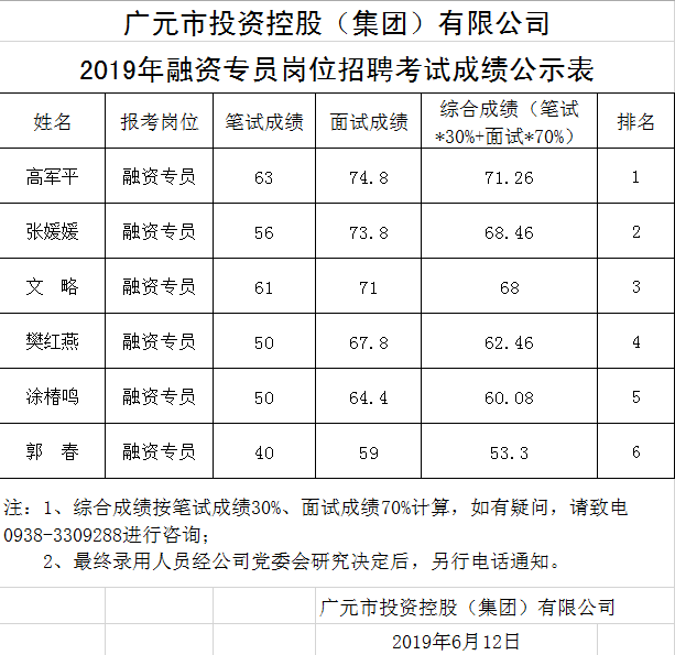 廣元市投資控股(集團)有限公司關(guān)于公開招聘工作人員成績公示表