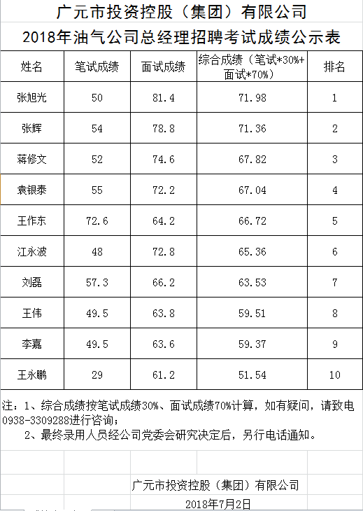 廣元市投資控股(集團)有限公司2018年油氣公司總經理招聘考試成績公示表