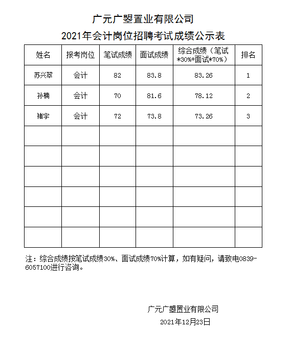廣元廣曌置業(yè)有限公司2021年會(huì)計(jì)崗位招聘考試成績公示